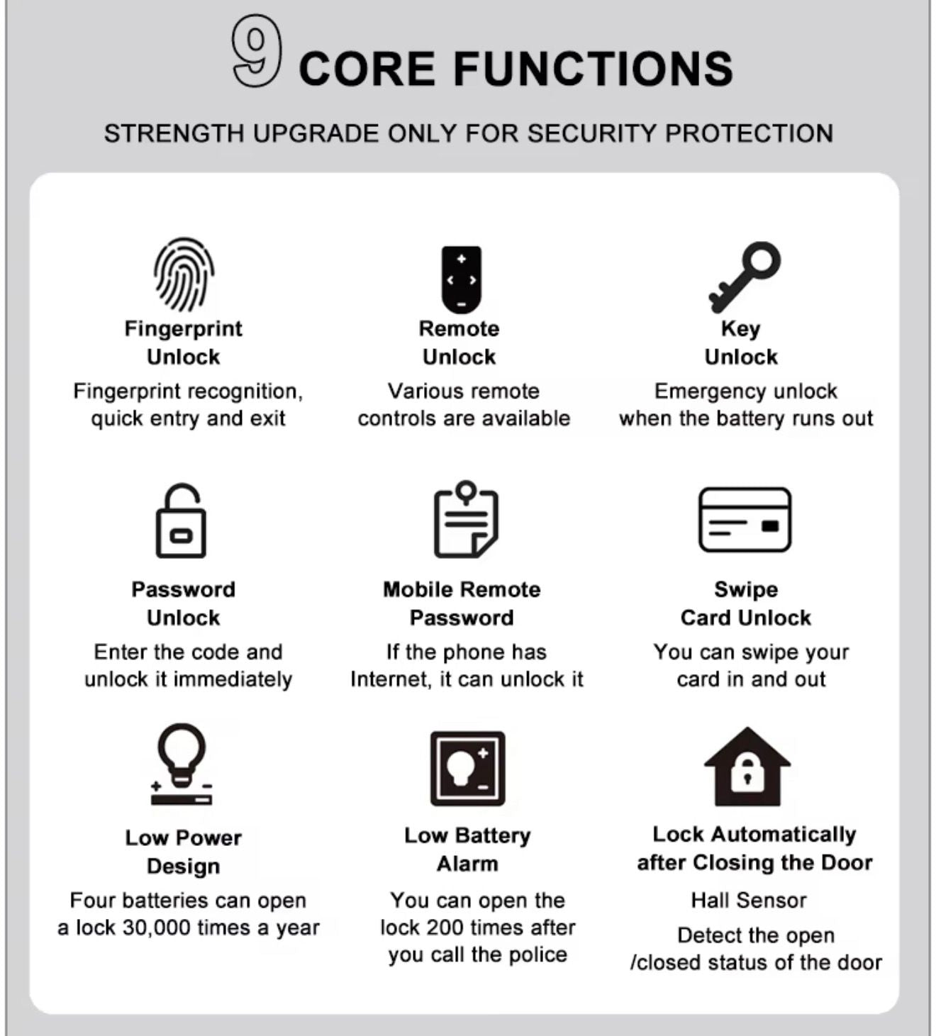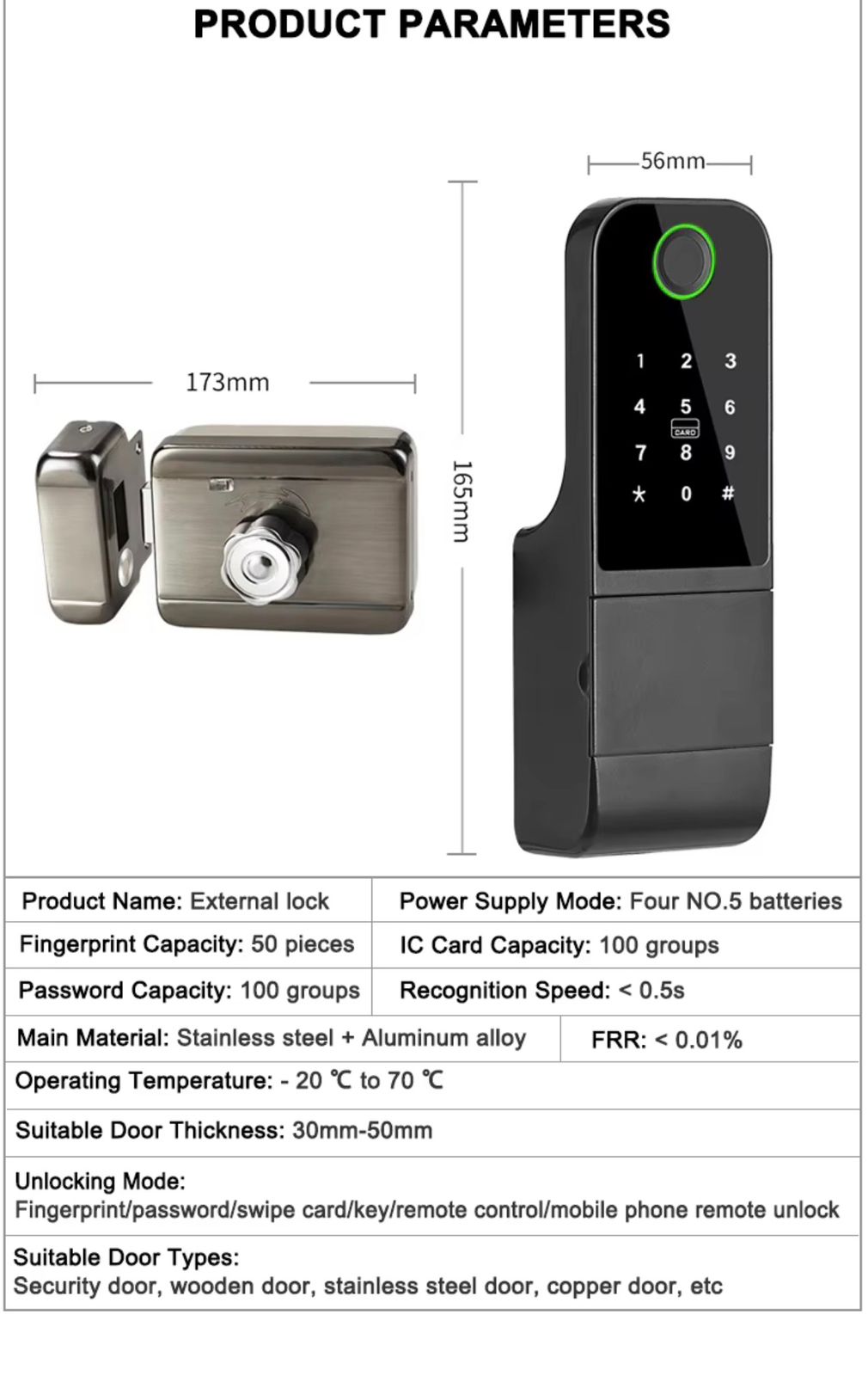 Smartphone App (Tuya/Smart Life): Unlock and manage the lock remotely via mobile App