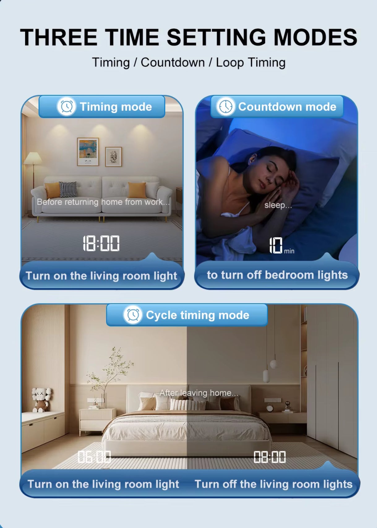 • Scheduling & Timers: Set schedules, timers, or loop timers for automatic on/off operation.