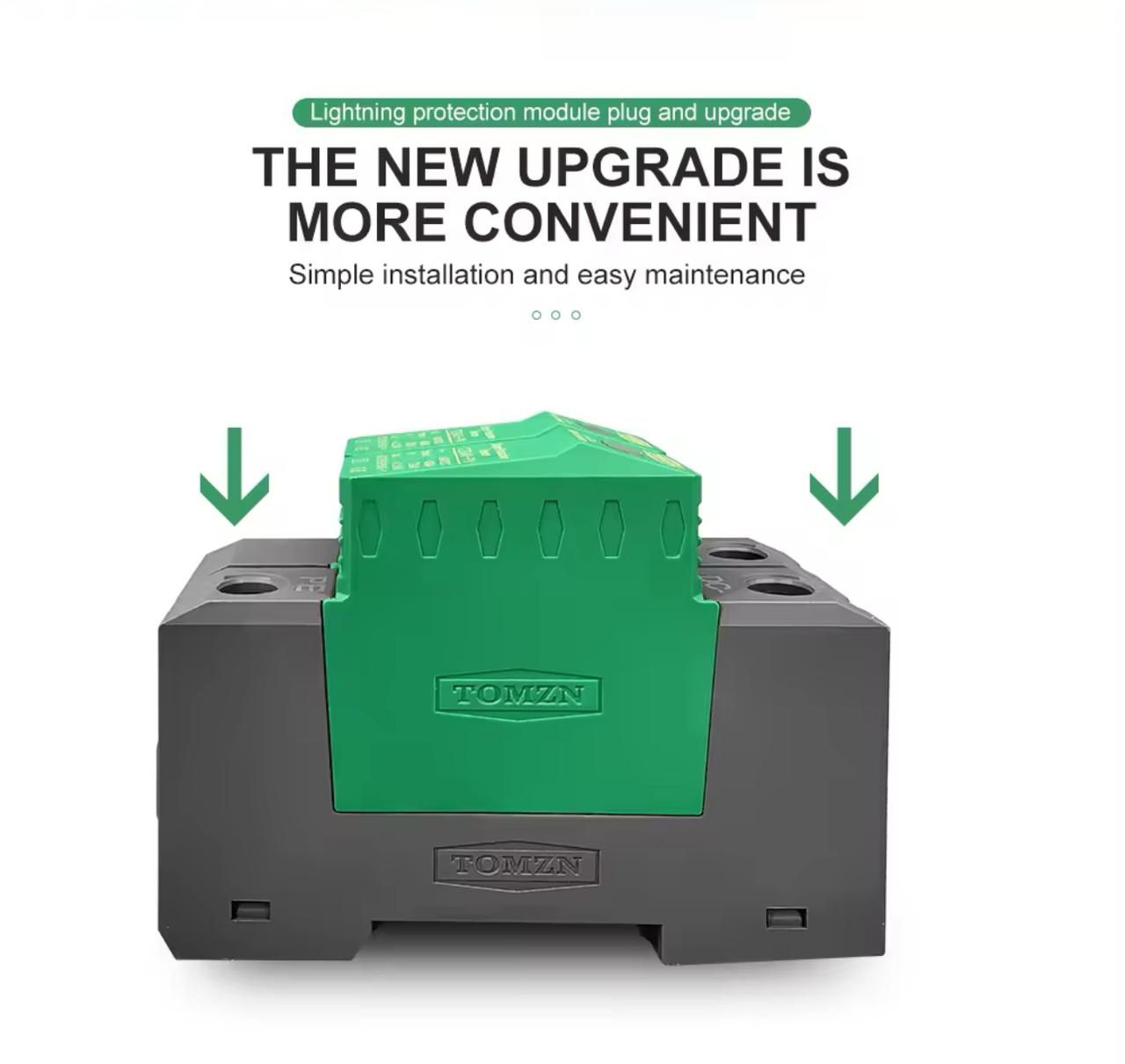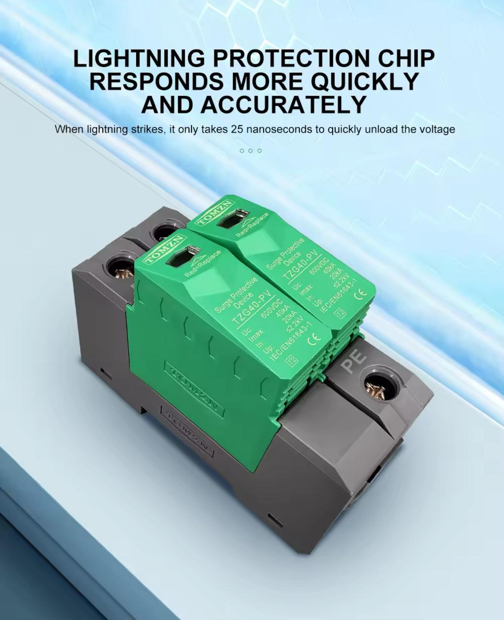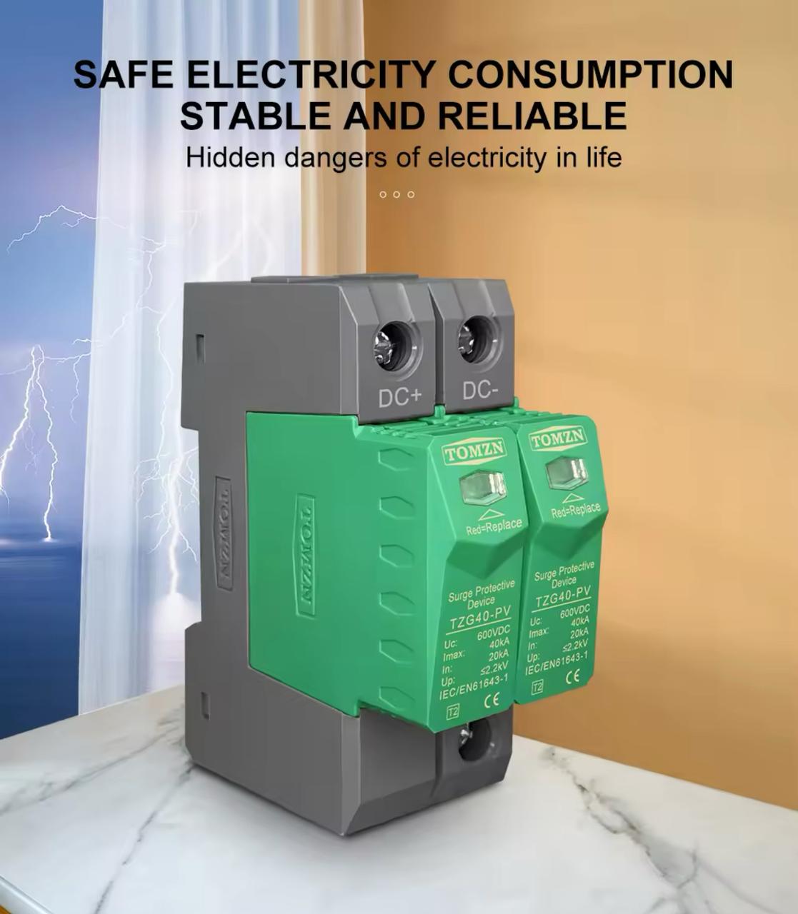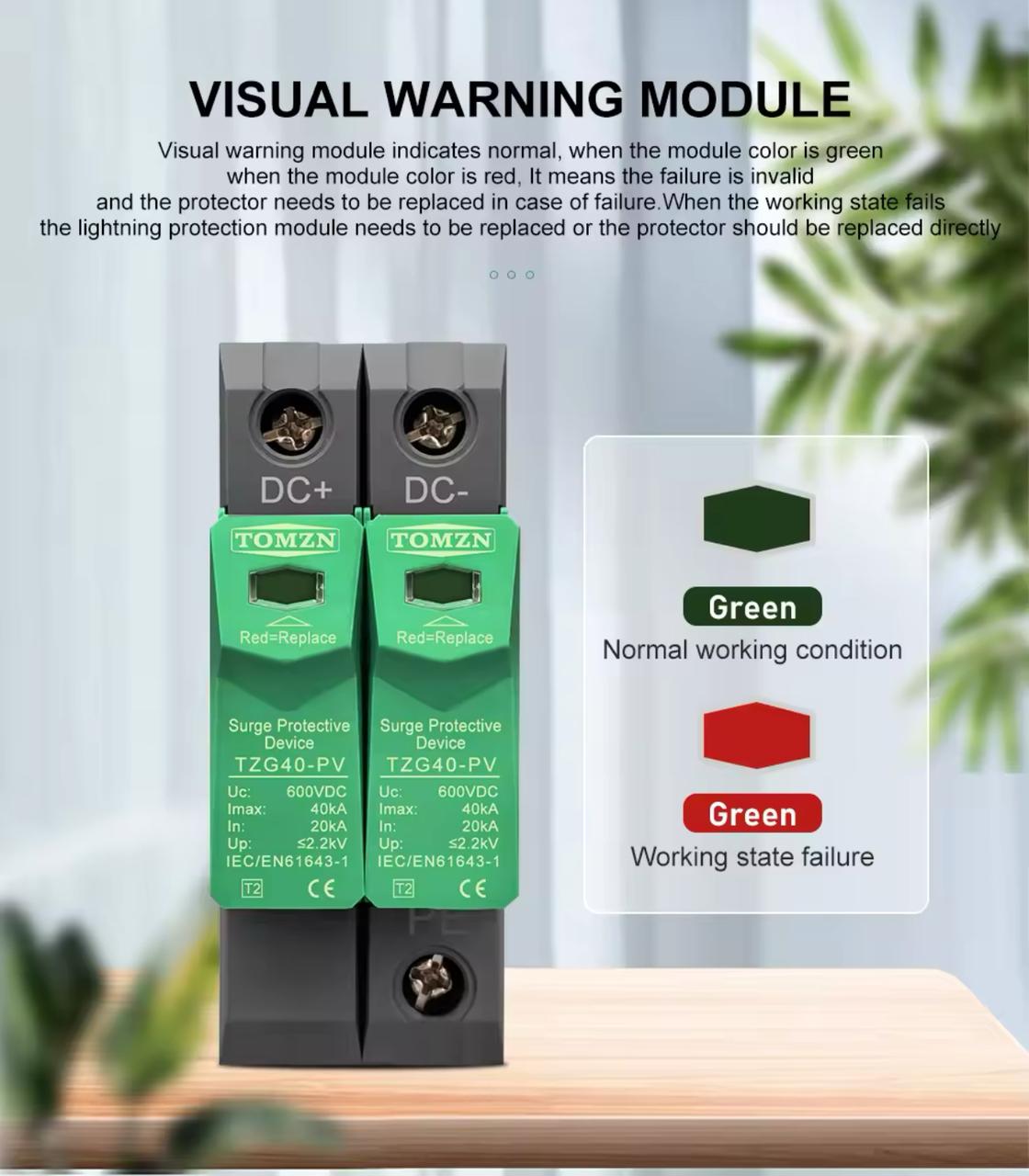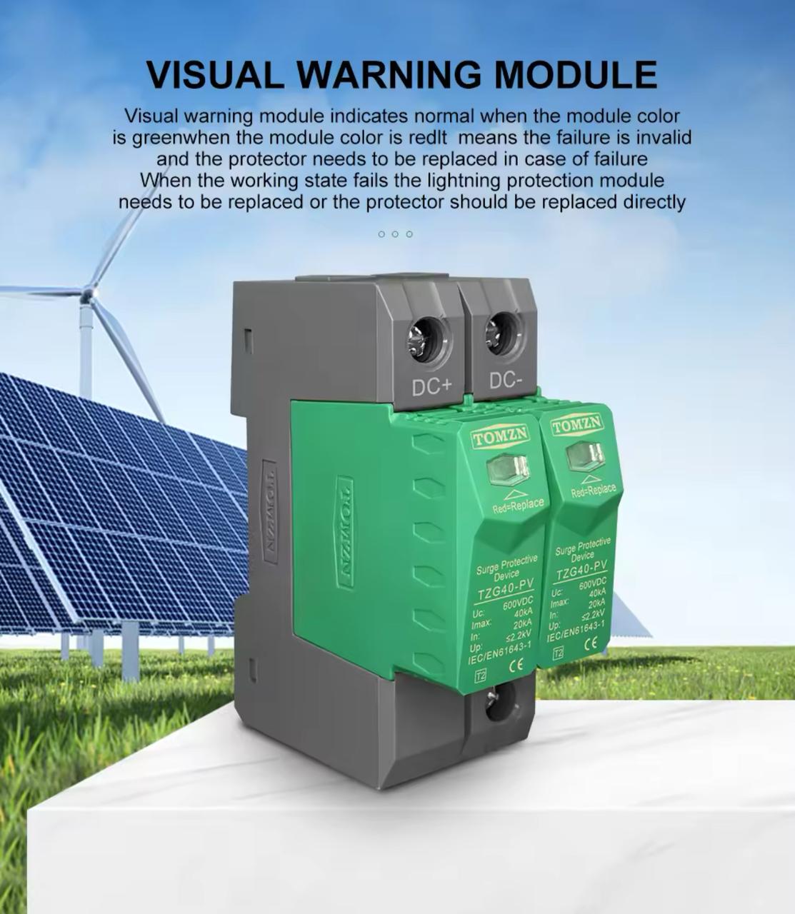 TZG40-PV DC surge protective device is applied low voltage standard IEC EN 61643-11 to protect against DC power line system and other equipment from over voltage and instantaneous over voltage damage. Widely used in photovoltaic comber box, power inverter, DC distribution cabinet etc. It has advantages of large discharge current, fast respond time, low residual voltage. Max. PV voltage up to UCPV ≤1000V dc. Main features 1. High discharge capacity, quick response, module pluggable; 2. Fast response time, din rail installation; 3. Double thermal disconnection devices, provide more reliable protection; 4. Green window means normal, red means defect, need to change module